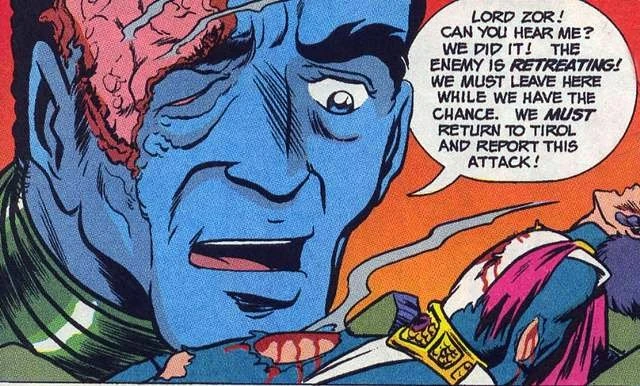 Breetai's looks over Zor as he dies, with a fresh wound. (Robotech Genesis: The Avenging)