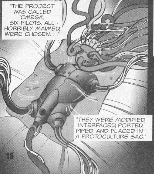 During the First Robotech War, the Earth Gov didn't know what Breetai's forces were capable of so they made a system of 6 horribly maimed pilots and linked them to the Veritechs for direct control. The 1st 5 died but the 6th was sent to Edwards base in California where he was built into the one of a kind mech VFX-66 Omega Valkyrie built in secret for the Omega Project. The gov chopped the pilot up and soaked him in pure Protoculture then wired him to the controls. He was sent on a test flight across the ocean but went off course to return home to Ohio, where his family lived before the war. On 13 October, 2012, he was near the Alaska Base, and attempted to contact Edwards. General Granger replied and attempted to order him but he closed the channel. Granger tried to get him back but was obliterated in the Rain of Death. Omega Six tried to make it to his location but it was wiped out in the enemy attacks and the AI had Error messages. He wanted to go home but was blasted out of the sky by Zentraedi Lasers and in 2047 awoke from a generations long coma with only 2 desires: Home and defeat the enemy, so he mistook the town of Rightfield and wiped it out. The Zentraedi Female Sarya Min-Qadderaq worked with Scott Bernard and his Megaroad crew to handle the mech but it took out one of the Vehicles and killed Victor Chen. Sarya ran up and the AI had errors between the program and the pilot's desires and she stabbed it in the face and called him by his name, Charles Brautigan, and saw he was in suffering. She used her swords to end him and his lingering consciousness thanked her for letting him go home (Robotech: Aftermath: Ghost Machine).