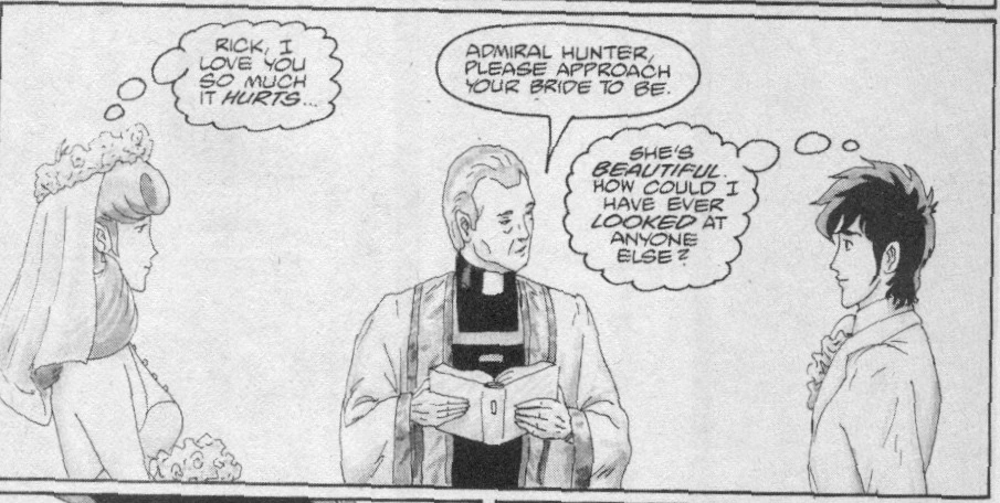 The minister leads the wedding of Rick Hunter and Lisa Hayes. (Robotech II: The Sentinels: "Wedding Day")