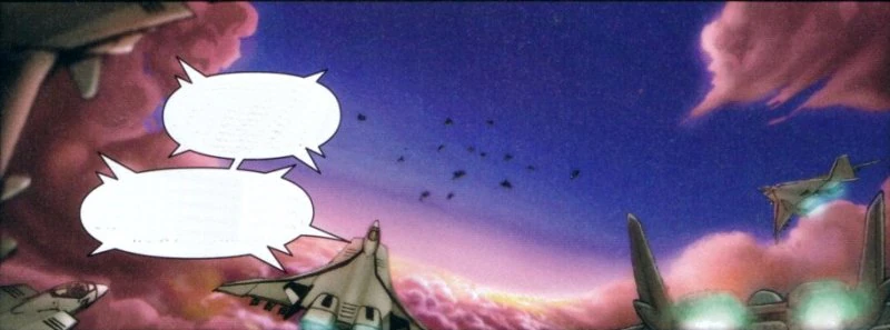 Skull Squadron provided fighter cover for the colony ship Ark Angel as it escaped from Liberty losing at least two fighters before the colony ship folded back to Earth. (Robotech: The Shadow Chronicles)