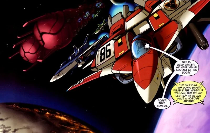 In 2043, Wolf was based on the SDF-3 with Jack Baker in command of the squadron. Wolf was scrambled to intercept T. R. Edwards after he fled the surface of Tirol in the stolen Icarus. The squadron was decimated by Ghost Squadron who were using Shadow technology making them invisible to Wolf Squadron's sensors. They lost 9 fighters before they were ordered to disengage. (Comic: "Robotech: Prelude to the Shadow Chronicles 1: The Enemy Within")